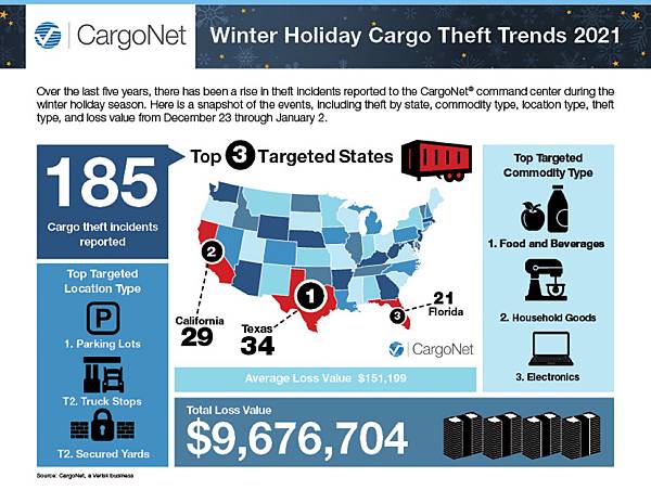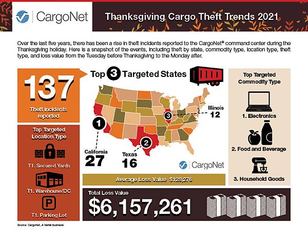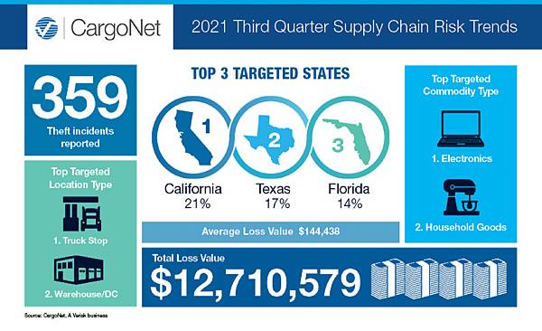 CargoNet 和 CBS 新聞報導,從 1 月到 9 月,據報導發生了高達 4500 萬美元的貨物盜竊事件。據 CargoNet 報導,2020 年,貨物盜竊達到 6800 萬美元,2019 年達到 4900 萬美元,預估貨物失竊的情況,會持續惡化至2022年。