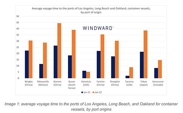 2022年1月,洛杉磯(Los Angeles)、長灘(Long Beach)和奧克蘭(Oakland)等港口仍在處理,自去年年底開始的壅塞危機。根據Windward數據,2022年第一周貨櫃輪在這些港口的平均停靠時間為10.9天,幾乎是2021年平均時間的2倍。