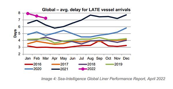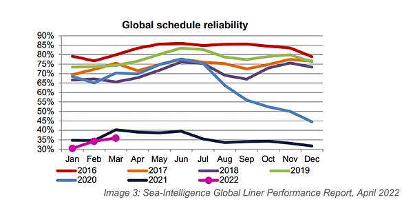 Sea Intelligence的最新全球貨櫃船績效報告數據顯示,全球準班率雖然在2022年3月略有提高,但從2020年至今,一直呈現下降趨勢。此外,由於歐洲和美國港口擁堵,船公司被迫取消了許多來自亞洲的航次,導致一些船舶無法正常航行。