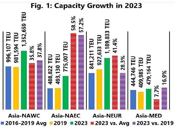 如圖1所示,當將 2023 年與 2019 年以及 2016-2019 年的運力增長率進行比較時,我們看到航商運力明顯的增長。亞洲 -北美西海岸運力增長 35%-38%,亞洲 -北美東海岸運力增長 57%-59%,亞洲 -北歐運力增長 28%-42%。亞洲 -地中海 的運力 是唯一接近疫情前水平的航線。