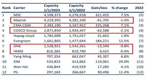 圖2: Alphaliner 最新 2023年 航商運力排名, 前 12大航商中, 與去年 的運力相比 ,只有 4家航商運力有微幅下降, 合計 減少 而另外 8家航商, 合計 增加的 運力則超過 75%。