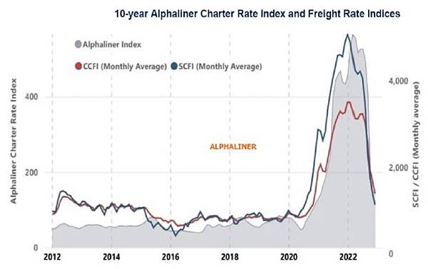 圖3: Alphaliner最新數據顯示,隨著貨櫃 運費市場的大幅下滑,集裝箱船舶的租金水平也應聲出現了大幅滑落。