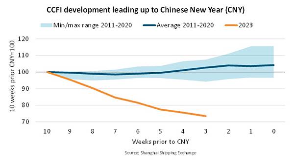 “從 2011 年到 2020 年,從春節前第十週到前三週的七週內,CCFI 平均上漲了 3%。最差的一年是 2012年,在這七週內 CCFI 下跌了 6%,而最好的一年是增長 8% 的2020年。2021 年和 2022 年的市場情況是獨一無二的,因為塞港和消費需求激增引領市場,春節前夕也很強勁。因此,2023 年的發展是迄今為止最糟糕的13 年,”Rasmussen 評論道。