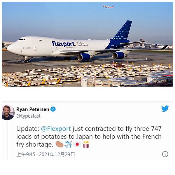 日本麥當勞則是去年12月中旬,出現薯條荒,因加拿大溫哥華港附近大水肆虐、阻礙交通,加上塞港影響,使得供應延遲,限定只供應小份的薯條,最後緊急簽約Flexport派三架波音747飛機(如圖2、3),以及與供應商、進口商合作,來解決薯條原料不足的問題。
