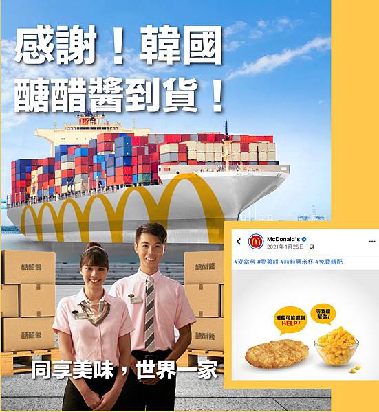 台灣麥當勞就因航運不穩,去年8月份暫停供應薯餅,12月因糖醋醬缺貨,從韓國支援來台(如圖1)。本週再次貼出公告,因近期全球航運供貨不穩,麥當勞門市的薯餅陸續短缺,並將於售罄後暫時停止銷售,目前正積極調度中,預計1月下旬完成補貨,即可恢復正常供應。另外國內某家連鎖早餐店,因薯餅供應商不同,暫無缺貨的情況,目前庫存量還有2個月。