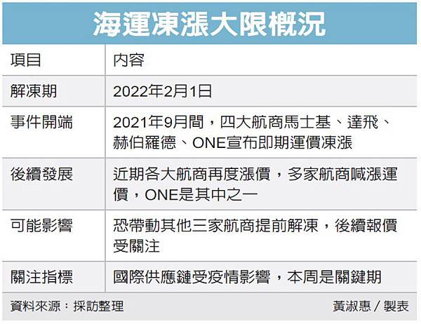 全球供應鏈壓力續升,馬士基(MAERSK)、達飛(CMA)、赫伯羅德(HPL)、ONE等歐日航商凍漲屆期,亞洲航商撐不住,還沒到2月「解凍日」,凍漲成員之一的ONE已撐不住喊漲,讓淡季變旺季,導致合約、即期運價雙漲。
