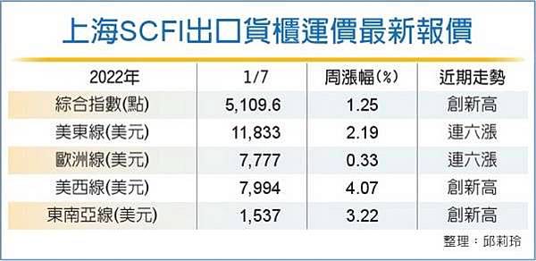 農曆過年前趕出貨,又遇到疫情發燒、美西港口持續壅塞,推升運價飆漲,SCFI最新報價,遠東到美西、東南亞線續創新高。