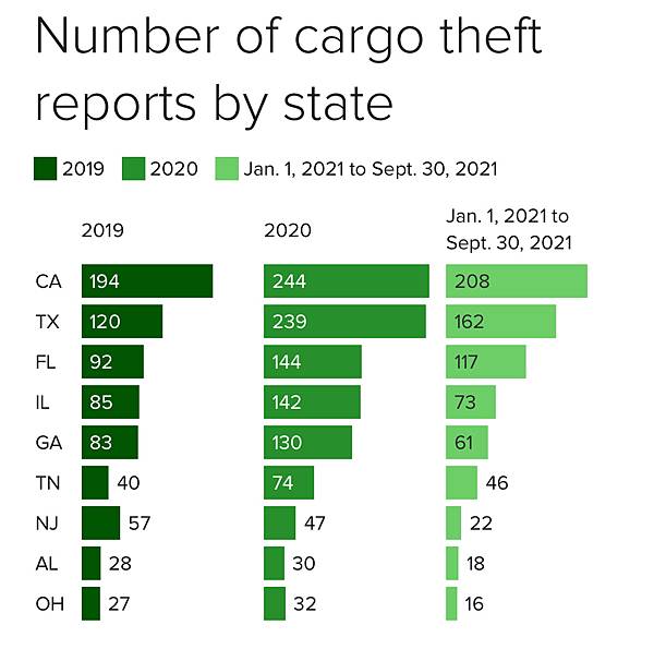CargoNet 和 CBS 新聞報導,從 1 月到 9 月,據報導發生了高達 4500 萬美元的貨物盜竊事件。據 CargoNet 報導,2020 年,貨物盜竊達到 6800 萬美元,2019 年達到 4900 萬美元,預估貨物失竊的情況,會持續惡化至2022年。