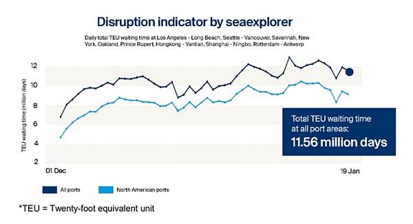 *目前九個“熱點”港口的中斷是 1,160 萬TUE等待天數,統計以來的最高水平之一