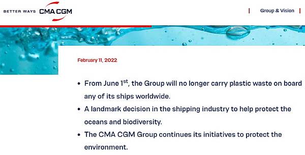 日前達飛(CMA CGM)執行長在海洋峰會上(One Ocean Summit)宣佈,該公司的船舶將不再運送任何塑膠垃圾,將於2022年6月1日生效。